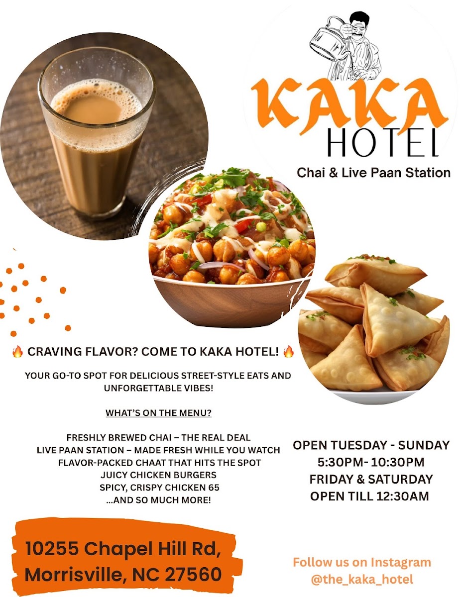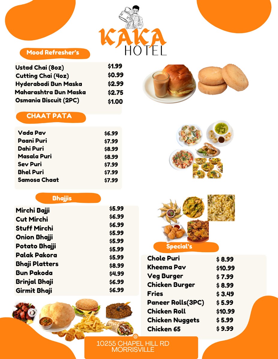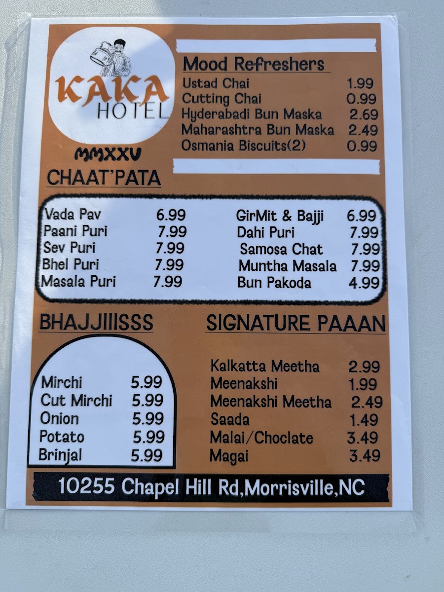 The menu at KAKA Hotel features a variety of Indian restaurant and cafe offerings, organized into distinct categories to cater to different tastes and dining occasions. Guests can choose from an assortment of savory snacks, signature paans, and refreshing beverages.